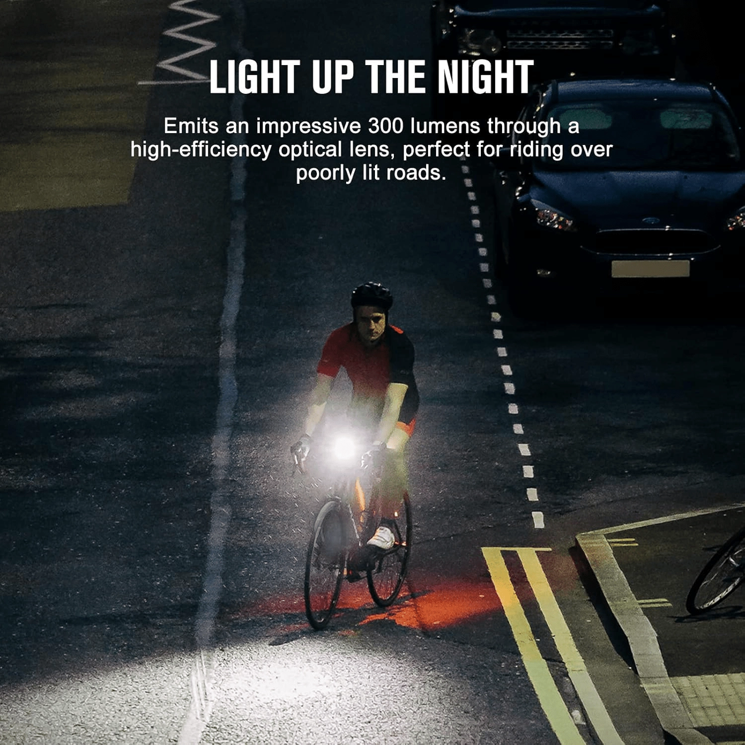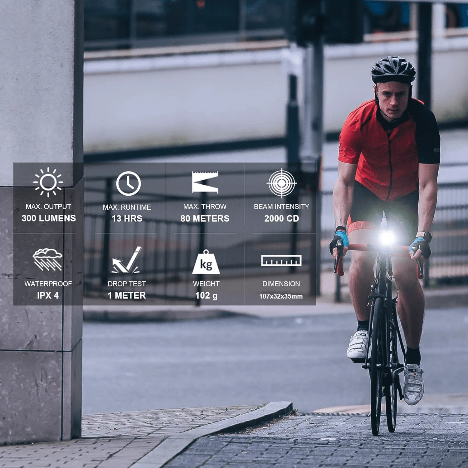 La LED haute performance fournit jusqu’à 300 lumens et une portée de 80 m. L’optique à faible éblouissement améliore la sécurité en ville comme sur route.