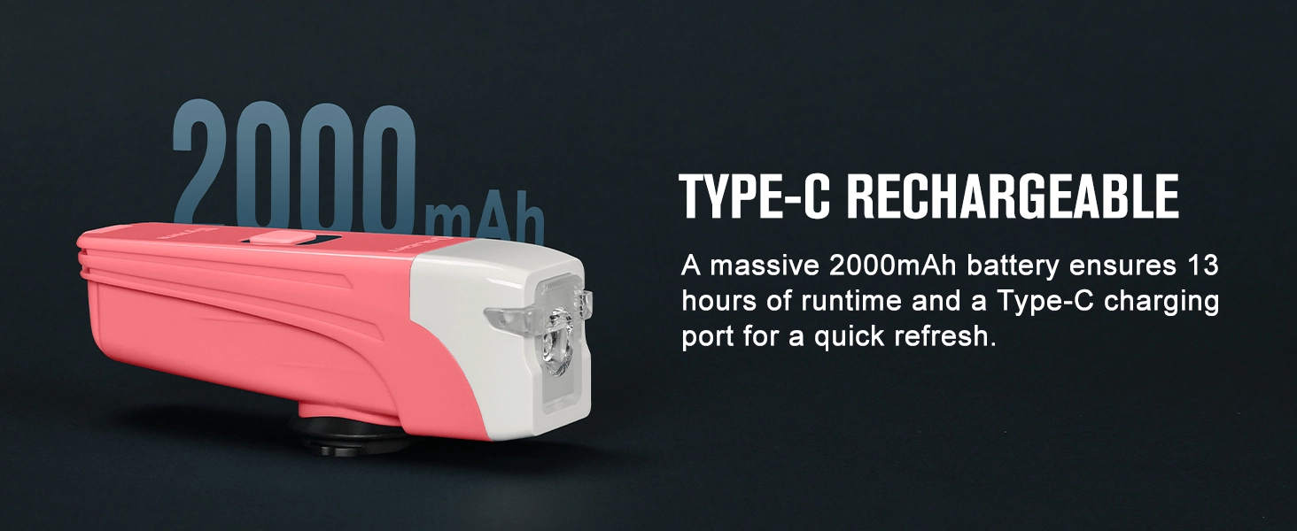 La batterie intégrée 3,7 V / 2000 mAh se recharge en environ 2,5 heures et offre jusqu’à 13 heures d’éclairage selon le mode.