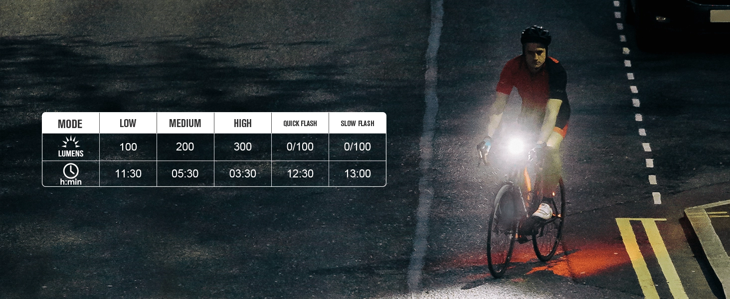 - Élevé 300 lm (3,5 h), Moyen 200 lm (5,5 h), Faible 100 lm (11,5 h), Clignotement lent 0/100 lm (13 h), Clignotement rapide 0/100 lm (12,5 h)