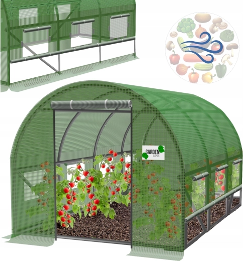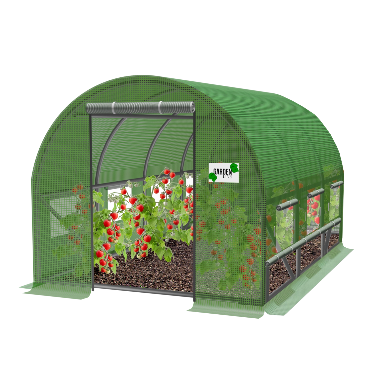 Des détails bien pensés améliorent le confort de culture : 6 fenêtres latérales avec moustiquaire pour une circulation d’air constante, porte frontale enroulable zippée pour un accès aisé et ventilation supplémentaire au bas du panneau pour évacuer l’excès de chaleur lors des journées chaudes. La lèvre de sol permet de la lester avec de la terre, améliorant la stabilité et l’étanchéité aux courants d’air.