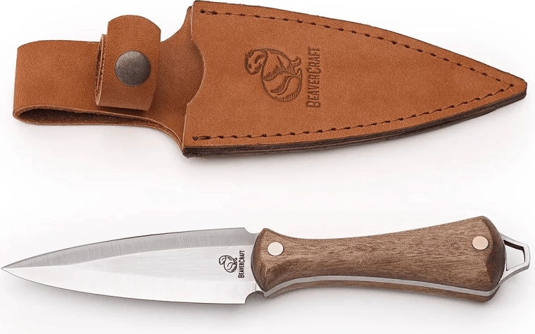 Dague de cou compacte BeaverCraft NCK1 offrant une construction full tang robuste, un acier inoxydable X50CrMoV15 et une poignée ergonomique en noyer européen. Idéale pour le port quotidien, la randonnée et le camping, elle est livrée avec un étui en cuir premium pour un port sûr et stylé autour du cou ou à la ceinture.