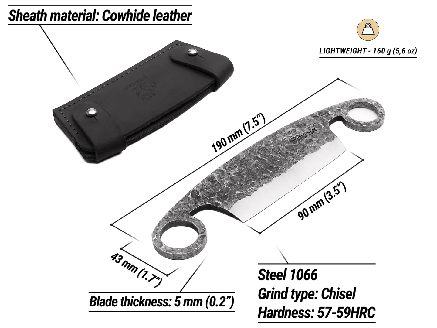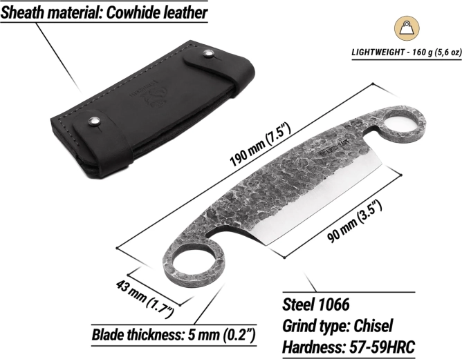 • Acier à haute teneur en carbone 1066 forgé à la main – longue tenue de tranchant et excellente aptitude à l’affûtage.