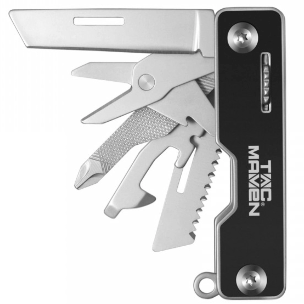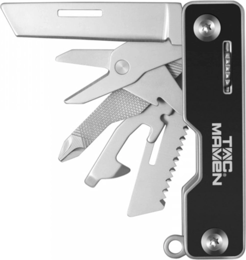 lame, ciseaux, scie, ouvre-boîtes, décapsuleur, lime à ongles, tournevis cruciforme, tournevis plat, anneau porte-clés