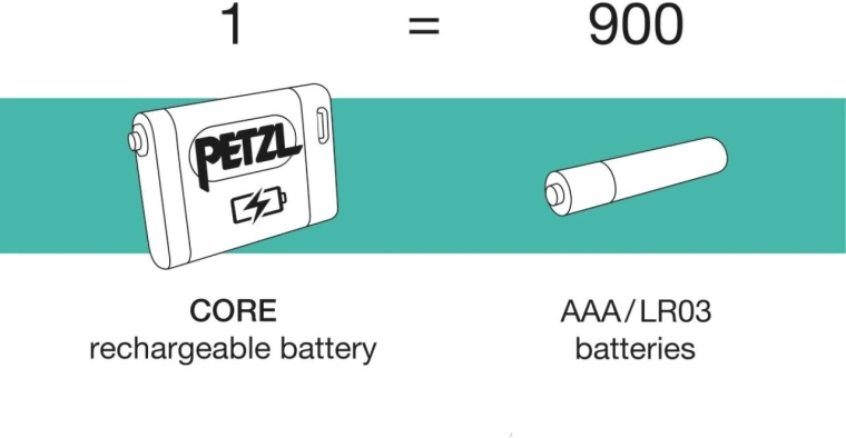 Inclut l’accumulateur CORE 1250 mAh rechargeable via USB‑C. Grâce au HYBRID CONCEPT, elle peut aussi utiliser 3× AAA (non fournies). La frontale reconnaît automatiquement la source d’énergie et adapte la puissance.
