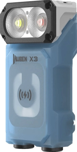 Lampe EDC compacte WUBEN X3 BLUE avec lumière blanche et rouge offrant jusqu’à 700 lm, portée de 102 m, autonomie jusqu’à 50 h et pratique tête rotative à 180°. Équipée d’un écran LCD d’état de la batterie et du mode, d’un clip à ressort pour un port aisé et d’une construction robuste IP65. Recharge sans fil via un boîtier en aluminium 3000 mAh avec entrée USB‑C.