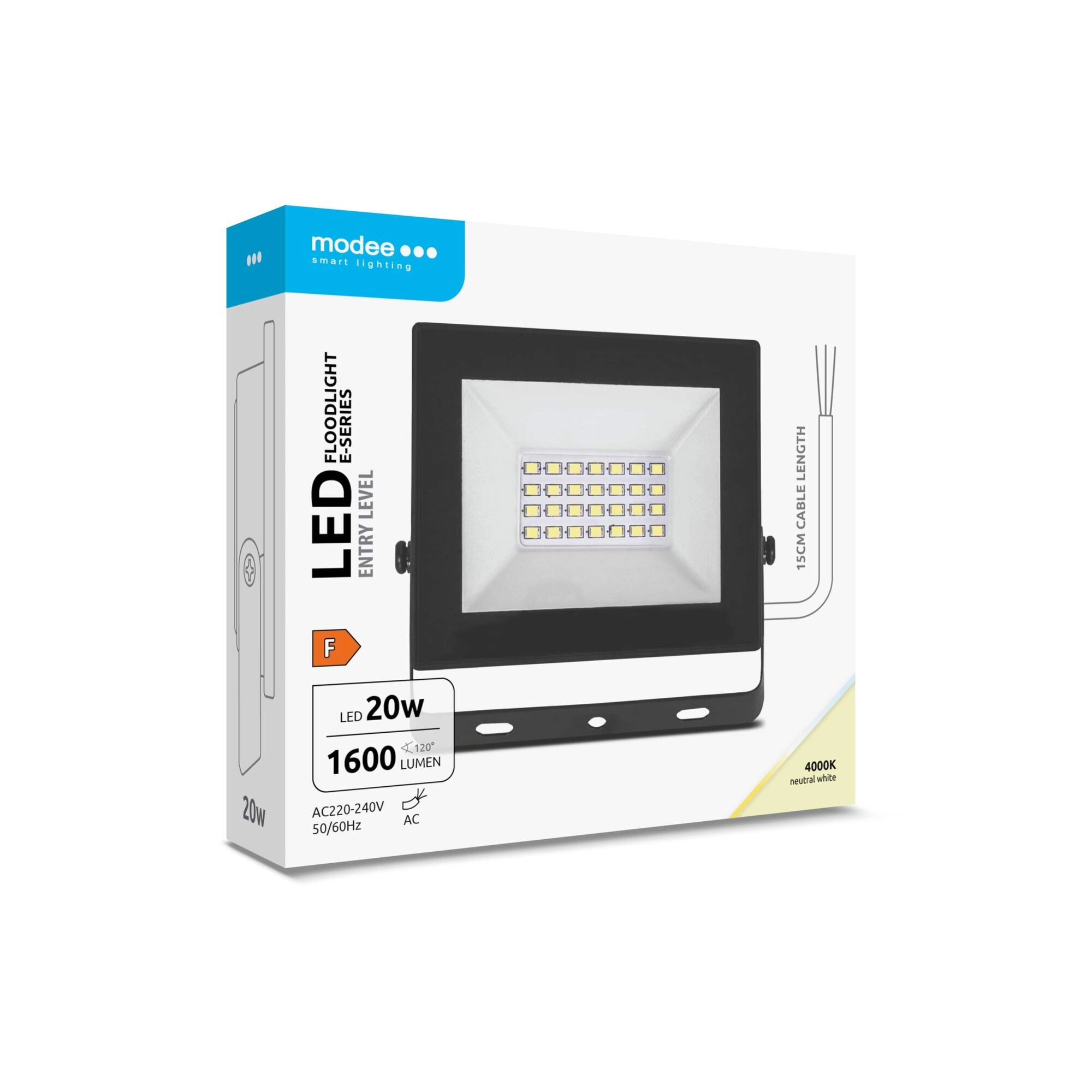 Vous cherchez un éclairage extérieur économe mais performant ? Le MODEE E‑series Slim associe un flux lumineux élevé de 1600 lm à une faible consommation de 20 W et une lumière blanche neutre de 4000 K, fidèle en rendu des couleurs et confortable pour les yeux. Son large angle de faisceau de 120° couvre efficacement une allée, un petit jardin, une terrasse ou une zone de travail.