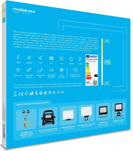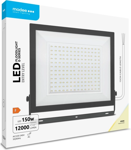 Projecteur LED d’extérieur performant Modee E‑series Slim offrant une puissance de 150 W, un flux lumineux de 12 000 lm et un large angle de faisceau de 120° pour un éclairage homogène de grandes surfaces. Grâce à l’indice de protection IP65, il résiste à la poussière et à l’eau, fonctionne sous AC 220–240 V et, avec une température de couleur de 4000 K (blanc neutre), garantit un rendu des couleurs naturel. Un câble d’alimentation de 15 cm facilite une installation rapide et pratique.