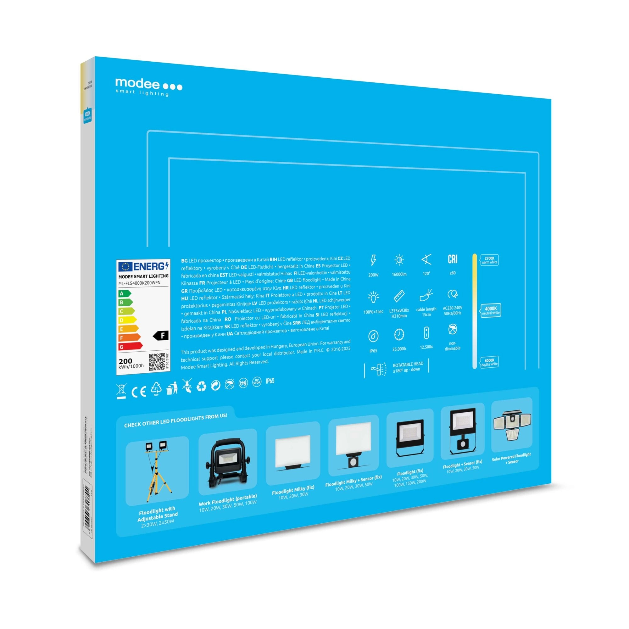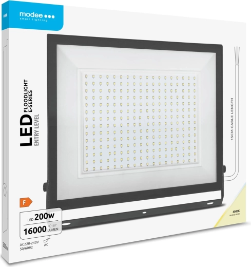 Le projecteur MODEE E‑series Slim allie faible consommation et haut rendement lumineux. Grâce à un flux de 16 000 lm et un angle de diffusion de 120°, il éclaire efficacement les accès de garage, terrasses, jardins, entrepôts et ateliers. La température de couleur 4000 K (blanc neutre) offre une lumière naturelle et non fatigante pour un usage quotidien.