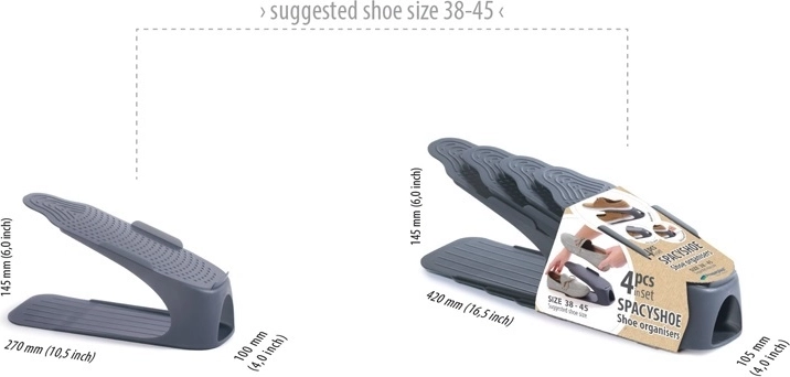 Gardez votre meuble à chaussures en ordre avec le lot d’organiseurs de chaussures Spacyshoe. Grâce au rangement double, vous économisez jusqu’à 50 % d’espace sur les étagères, la finition transparente offre une vue d’ensemble claire et la surface antidérapante assure la stabilité. Le plastique résistant se nettoie facilement et convient aux tailles 38–45 ainsi qu’aux chaussures d’une hauteur jusqu’à 12 cm.