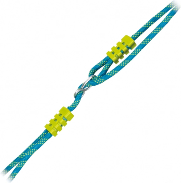 Les cordes bleues avec éléments jaunes disposent d’œillets et d’anneaux métalliques pour une suspension rapide et un réglage fluide de la longueur jusqu’à 200 cm.