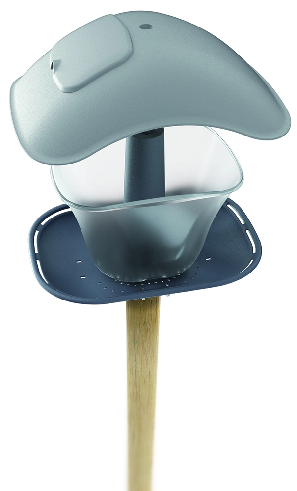 Grâce à sa conception bien pensée, la nourriture s’écoule facilement et reste protégée sous le toit. Adaptez l’installation à votre environnement : la mangeoire peut être suspendue à une branche, fixée à une rambarde à l’aide d’une sangle, ou montée sur un poteau pour une solution stable au sol.