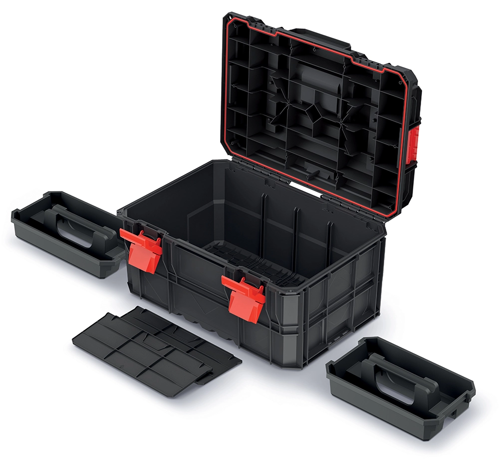 La mallette à outils X-Block Pro est conçue pour les professionnels qui ont besoin d’une solution fiable et robuste pour le transport et le stockage d’outils lourds. La construction modulaire permet le raccordement facile de plusieurs boîtes via des verrous latéraux, créant ainsi un système portable et stable.