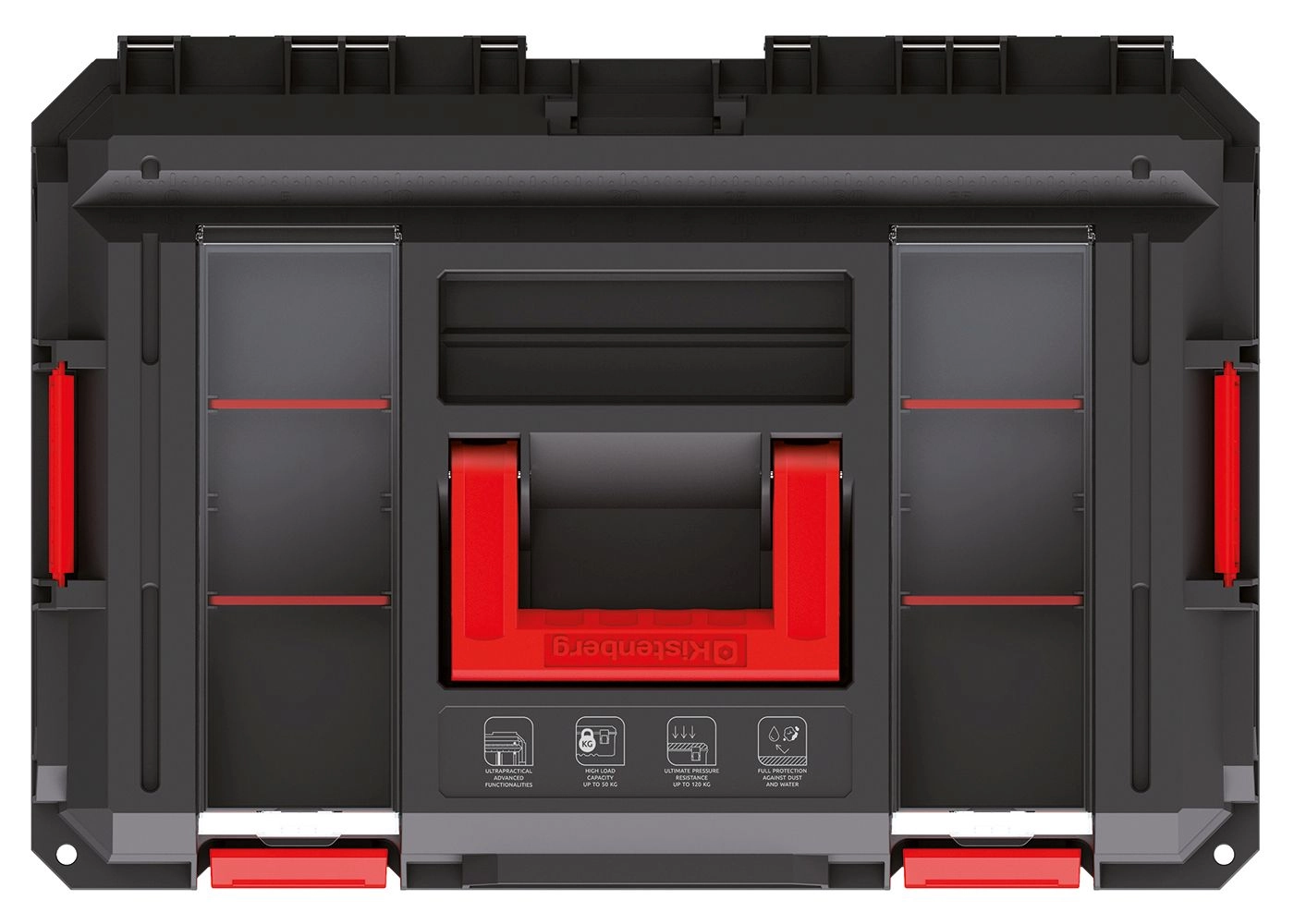 Parois nervurées, charnières renforcées et solides boucles garantissent une longue durée de vie. La capacité du coffre atteint 50 kg, la charge directe des modules jusqu’à 120 kg.