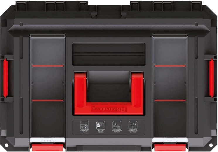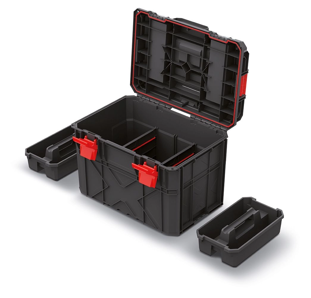 Le coffre à outils professionnel de la gamme X-Block est conçu pour un usage quotidien dans des conditions exigeantes. Le système modulaire avec connecteurs à verrouillage permet d’empiler et de relier plusieurs boîtes en une solution mobile sécurisée. Le joint d’étanchéité intégré protège le contenu de la poussière et de l’eau, tandis que la structure nervurée et les éléments renforcés augmentent la résistance aux chocs mécaniques.