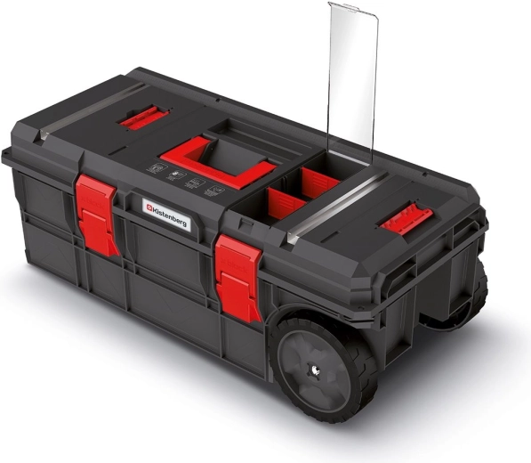 Deux roues robustes et une poignée de traction télescopique permettent de déplacer sans effort des outils lourds.