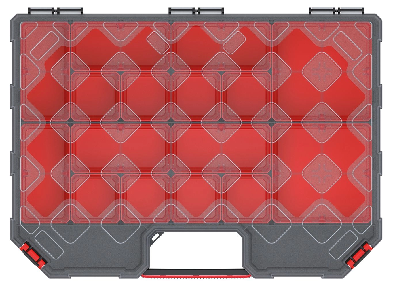 Les couvercles transparents permettent de contrôler le contenu d’un seul coup d’œil, tandis que les fermetures rouges robustes maintiennent les pièces en place en toute sécurité lors du transport.