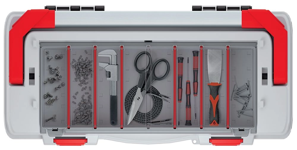La mallette à outils EVO pratique avec une poignée métallique robuste offre une organisation bien pensée grâce à un insert amovible et à un compartiment extérieur verrouillable avec cloisons réglables. Idéale pour un rangement clair des outils à la maison comme à l’atelier.