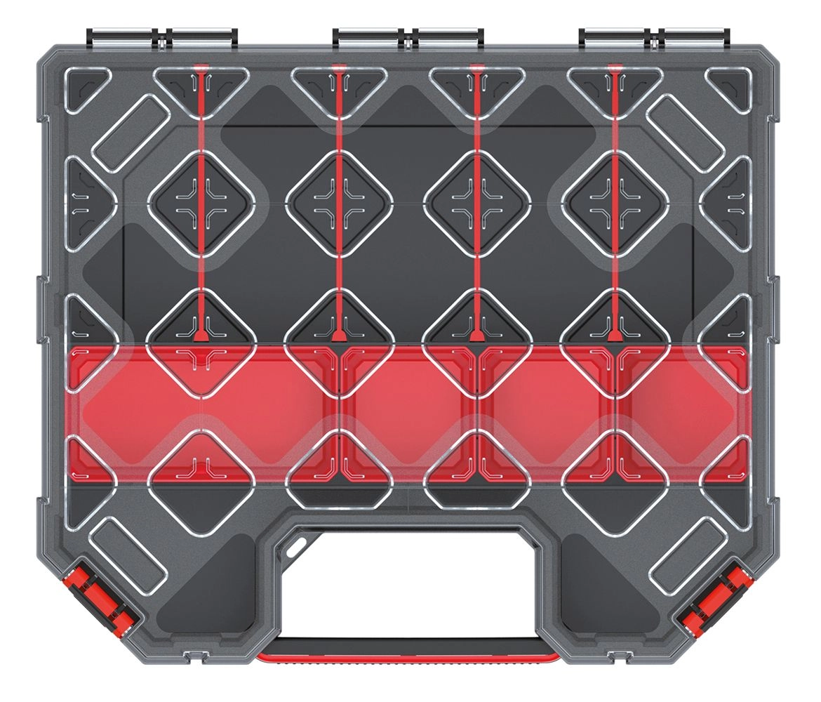 L’organiseur Tager Carbo Plus aide à maintenir l’ordre pour les vis, chevilles, embouts et autres petites pièces. Le couvercle en polycarbonate résiste aux chocs et permet de vérifier facilement le contenu sans l’ouvrir. Les cloisons et boîtes modulables peuvent être organisées selon les besoins du moment.