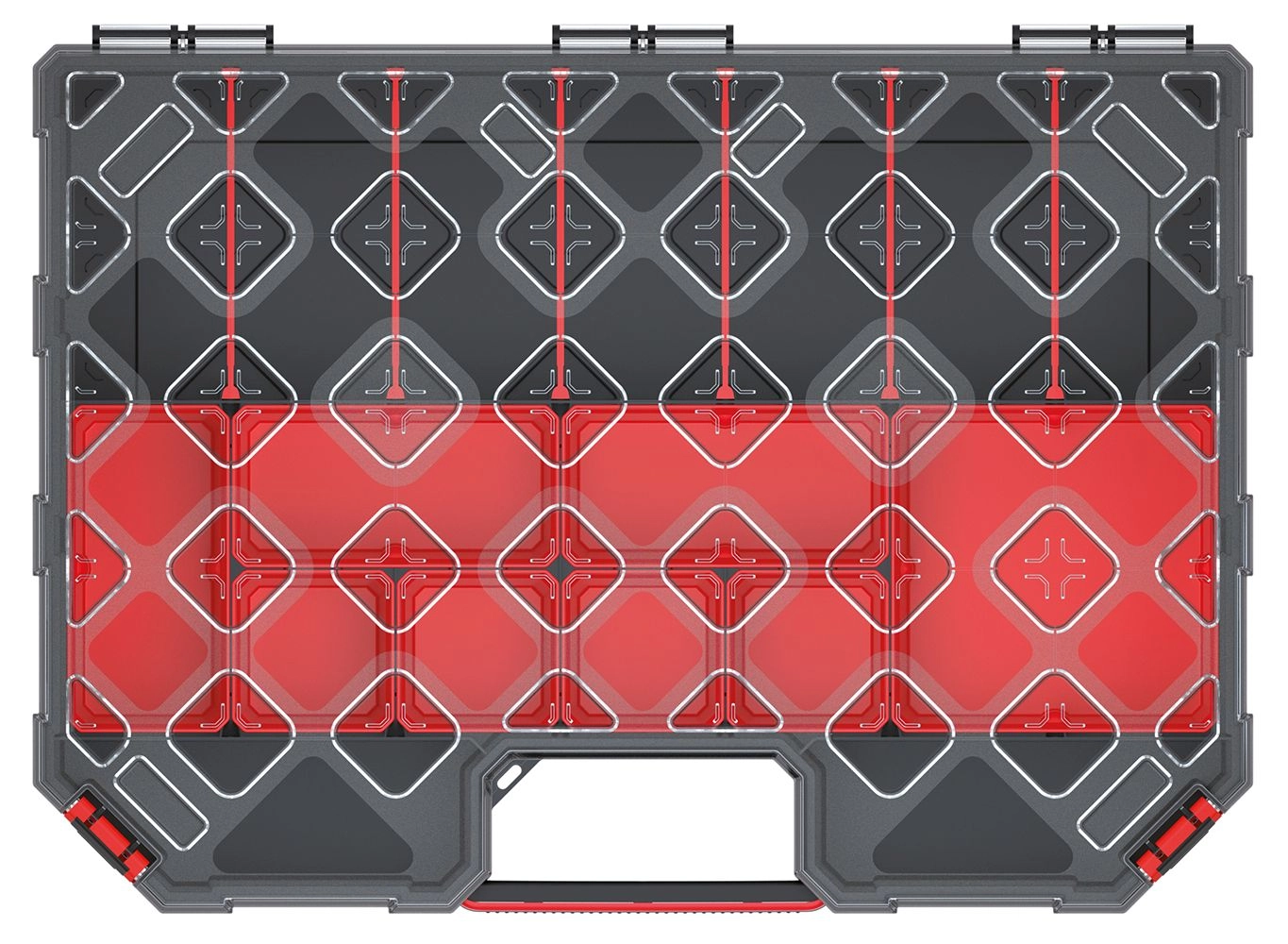 Grâce aux cloisons modulables, vous créez facilement votre propre agencement de compartiments selon vos besoins. L’organiseur convient aux professionnels comme aux bricoleurs qui souhaitent garder leurs matériaux et accessoires en ordre.