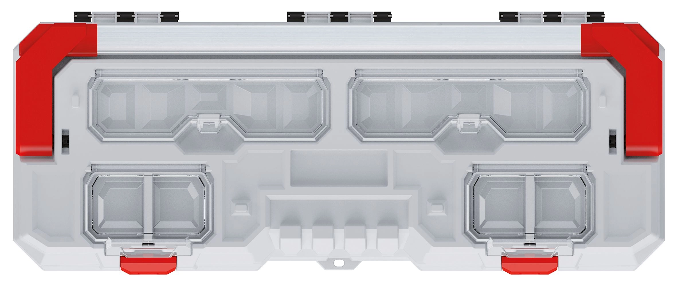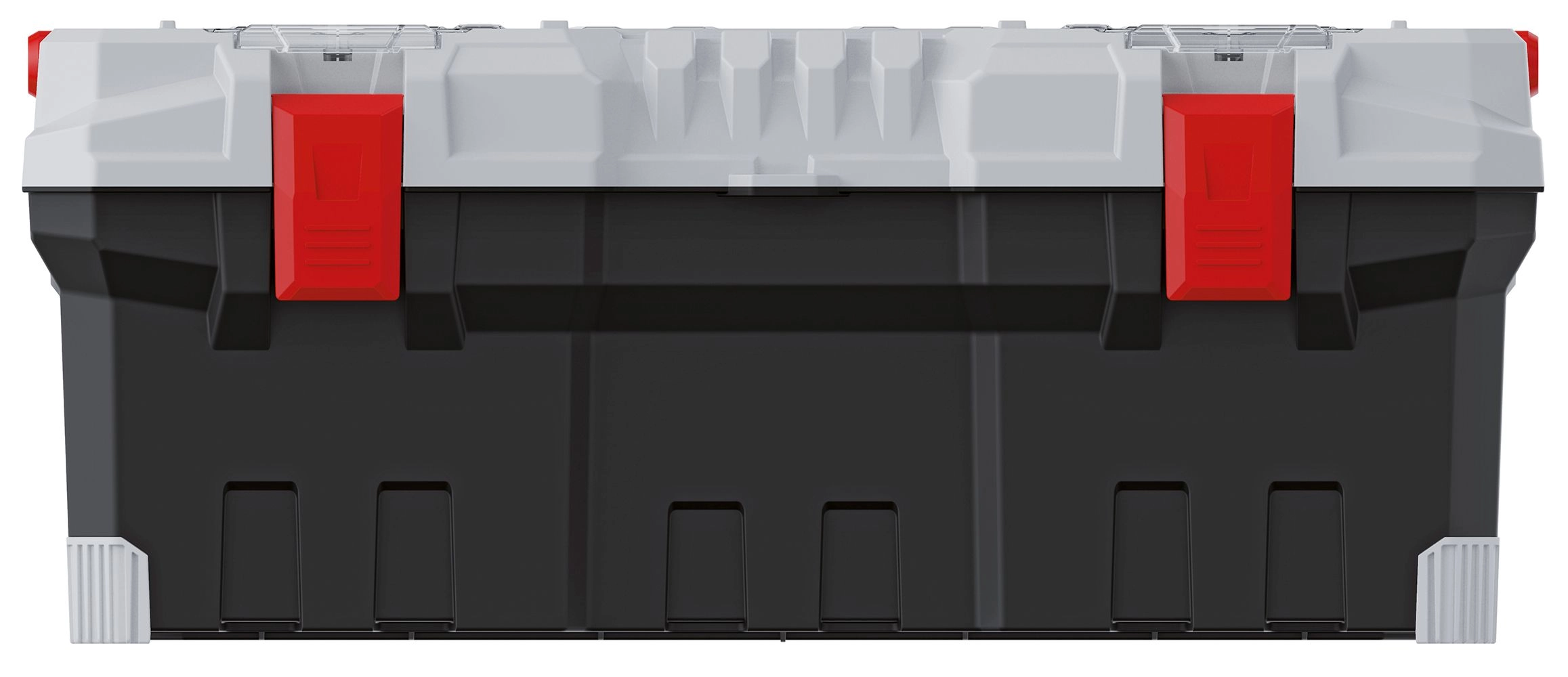 Des loquets rouges solides et des angles renforcés garantissent stabilité, résistance et stockage sécurisé des outils au travail comme pendant le transport.