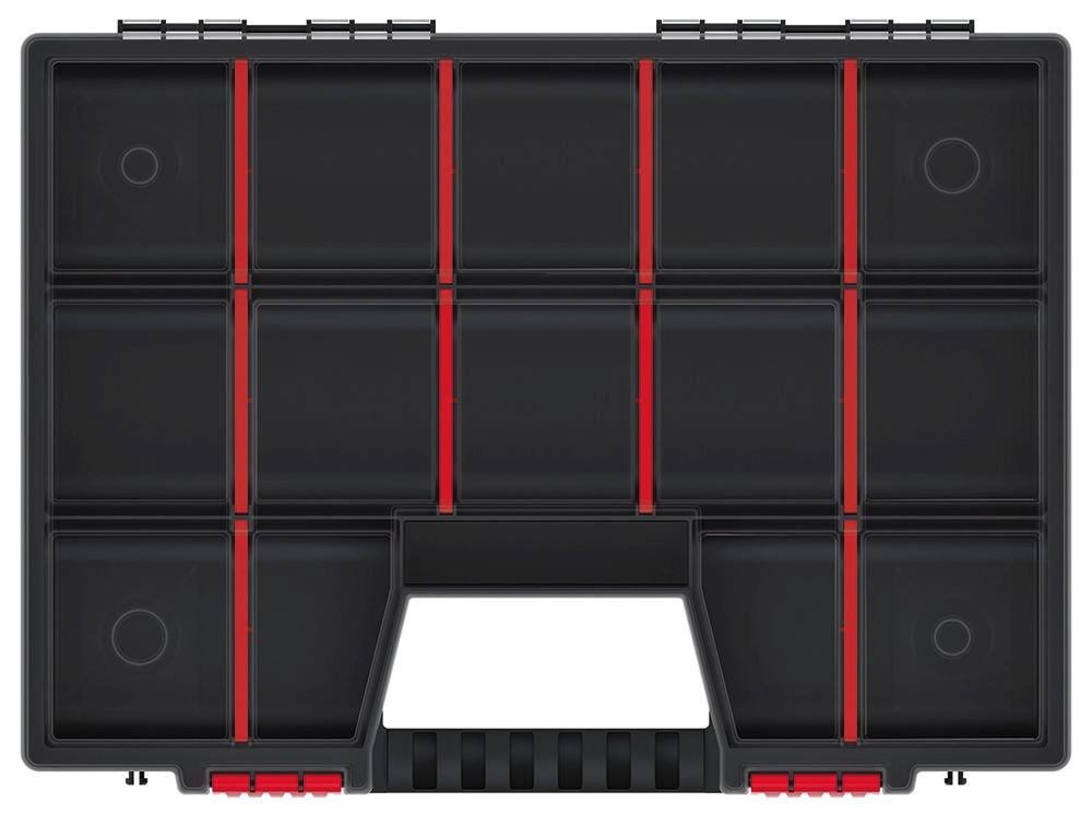 L’organiseur en plastique NOR est idéal pour ranger de manière claire les vis, écrous, rondelles ou joints. Grâce au couvercle transparent, vous avez une vue immédiate sur le contenu, et les compartiments réglables jusqu’à 15 sections s’adaptent à vos besoins. Une poignée ergonomique facilite le transport et de solides clips rouges assurent une fermeture sécurisée. Le plastique PP robuste de couleur noire garantit une longue durée de vie.