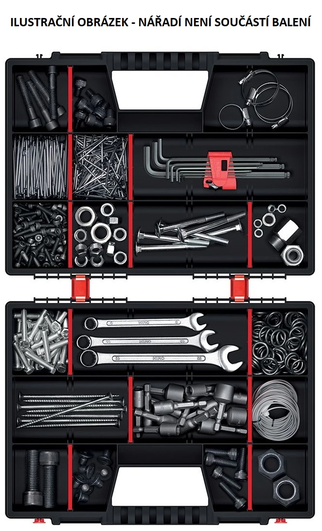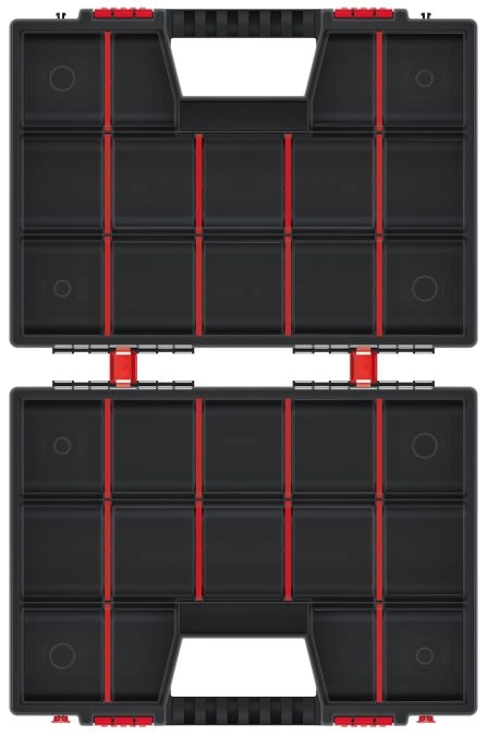 L’espace intérieur se personnalise facilement grâce aux cloisons amovibles – créez exactement les compartiments dont vous avez besoin. Le plastique robuste, les doubles verrous et les couvercles orientés l’un vers l’autre maintiennent tout en sécurité, même pendant le transport.