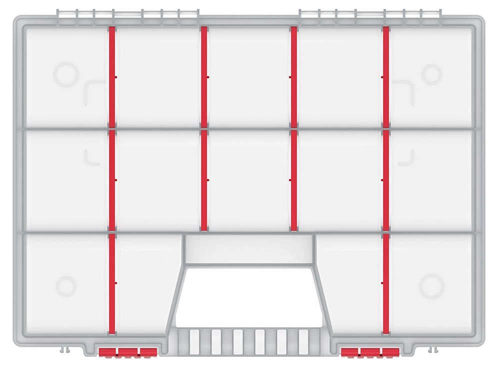 L’organisation flexible est assurée par des cloisons amovibles – vous adaptez facilement la taille et le nombre de compartiments selon vos besoins. La poignée ergonomique facilite le transport et les clips solides maintiennent le couvercle bien fermé même en déplacement.