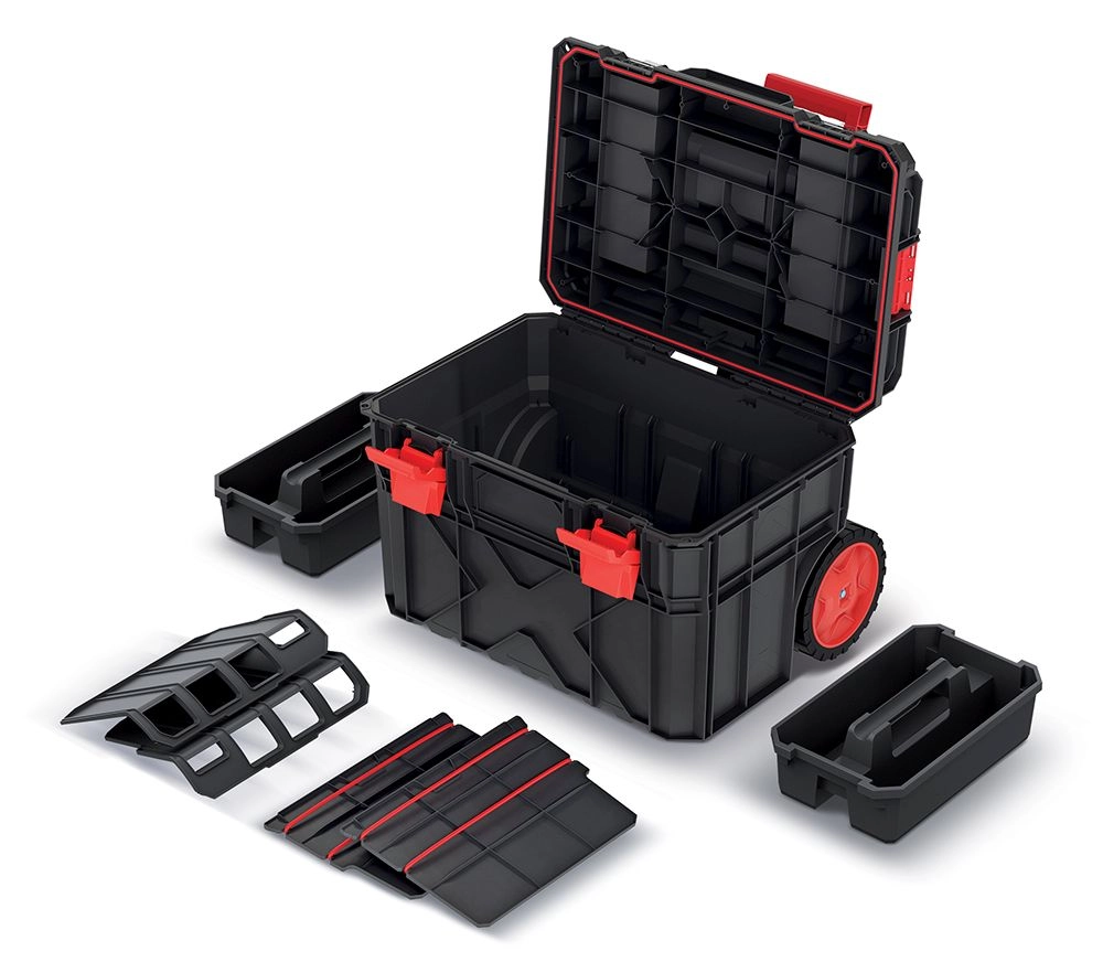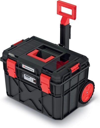 Coffre à outils professionnel sur roulettes avec structure Kistenberg X BLOCK LOG offrant une étanchéité totale, un corps nervuré robuste et une capacité de charge jusqu’à 50 kg. Grâce à la poignée télescopique et aux roulettes en élastomère à bande de roulement, il se déplace facilement même sur terrain exigeant. Une organisation intérieure astucieuse avec supports et cloisons maintient vos outils ordonnés et en sécurité sur chaque chantier.