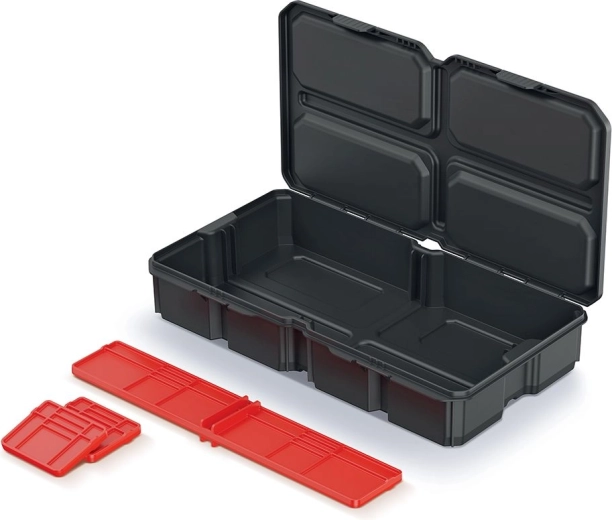 Organisateur pratique pour petits outils et éléments de fixation, dimensions compactes 28,5 × 15,8 × 5,7 cm. Grâce au plastique résistant, au couvercle transparent et à trois séparateurs amovibles, vous adaptez facilement l’espace intérieur à vos besoins. Idéal pour l’atelier, le garage ou le bureau.