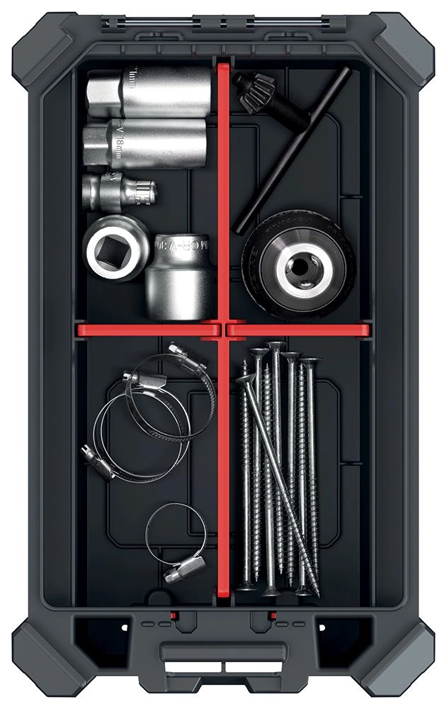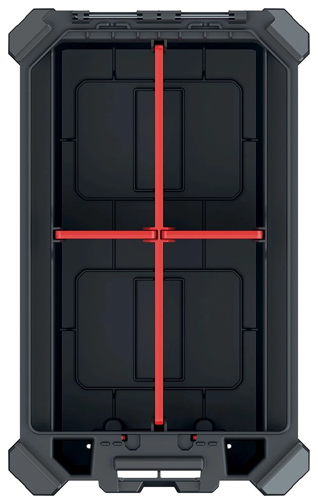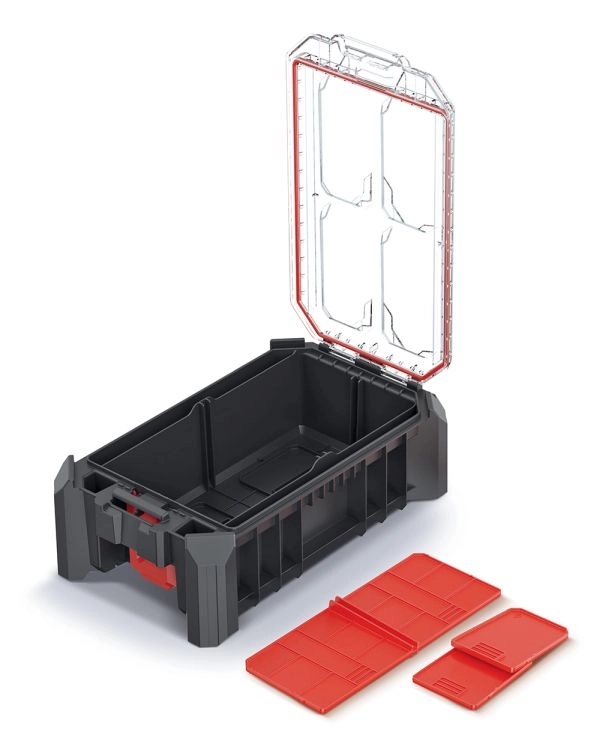 L’espace intérieur se personnalise facilement à l’aide de 3 cloisons amovibles. Les charnières métalliques accroissent la longévité, et la fermeture sécurisée est complétée par le système MSX d’emboîtement/empilage, qui permet de relier plusieurs organiseurs ensemble et d’économiser de la place lors du stockage et du transport.