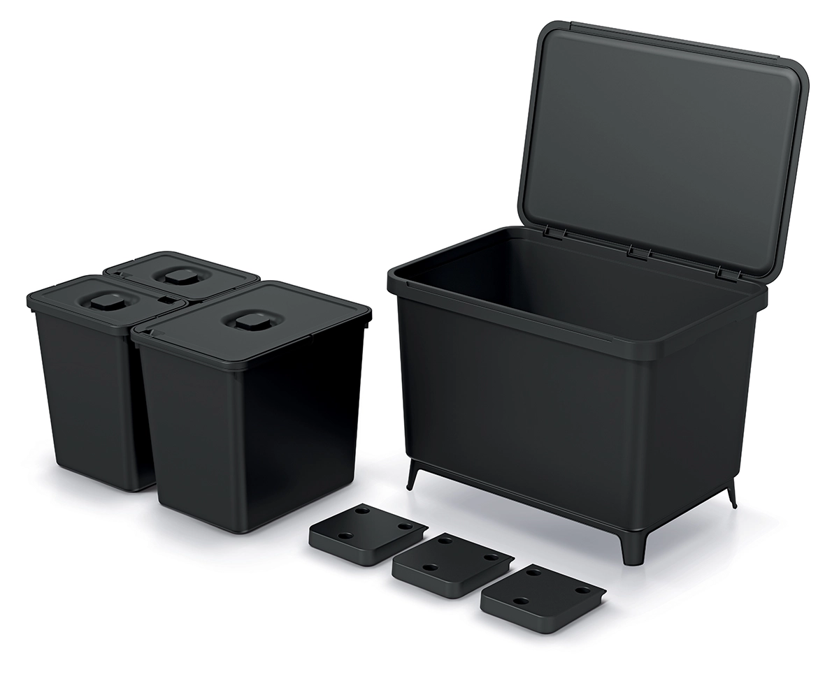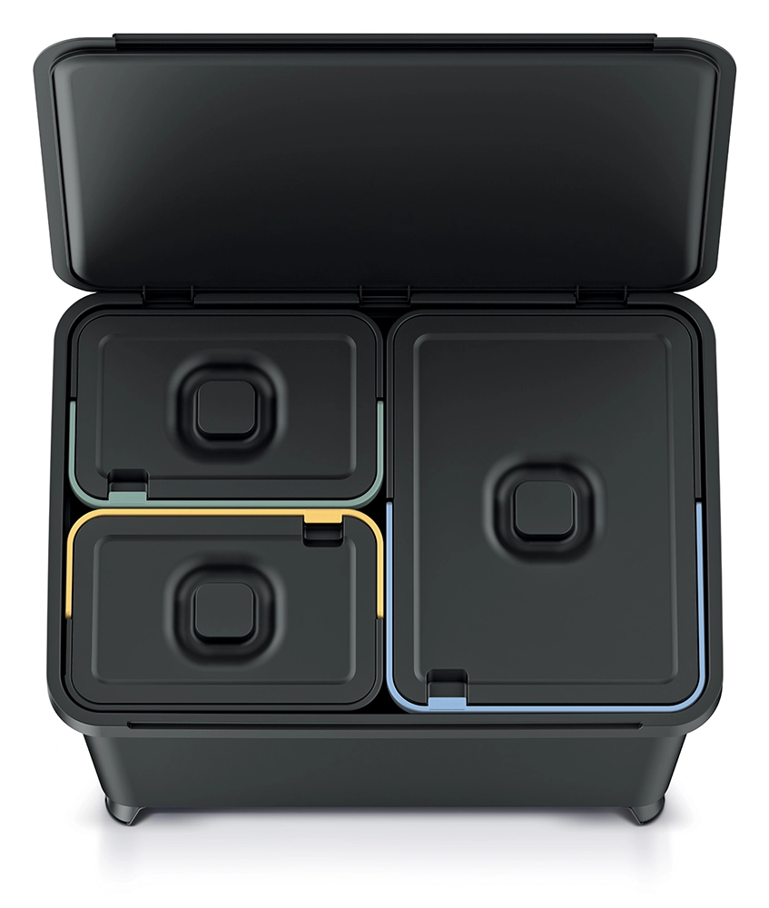- Trois bacs séparés – 1× 23 l pour les ordures ménagères et 2× 10 l pour le tri.