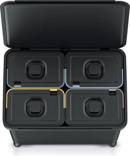 Les bords colorés sur les bacs intérieurs accélèrent l’orientation lors du tri. Chaque bac dispose de poignées ABS robustes pour un retrait et un transport en toute sécurité. Le couvercle basculant permet de déposer les déchets confortablement sans retirer toute la partie supérieure.
