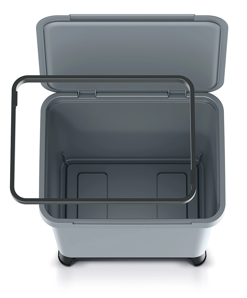 Le cadre intérieur pratique maintient le sac en place de façon fiable, évitant qu’il ne glisse vers l’intérieur. La base/pieds surélevés améliorent la stabilité, favorisent la circulation de l’air et facilitent le nettoyage sous la poubelle. La surface lisse se nettoie aisément et résiste aux taches.
