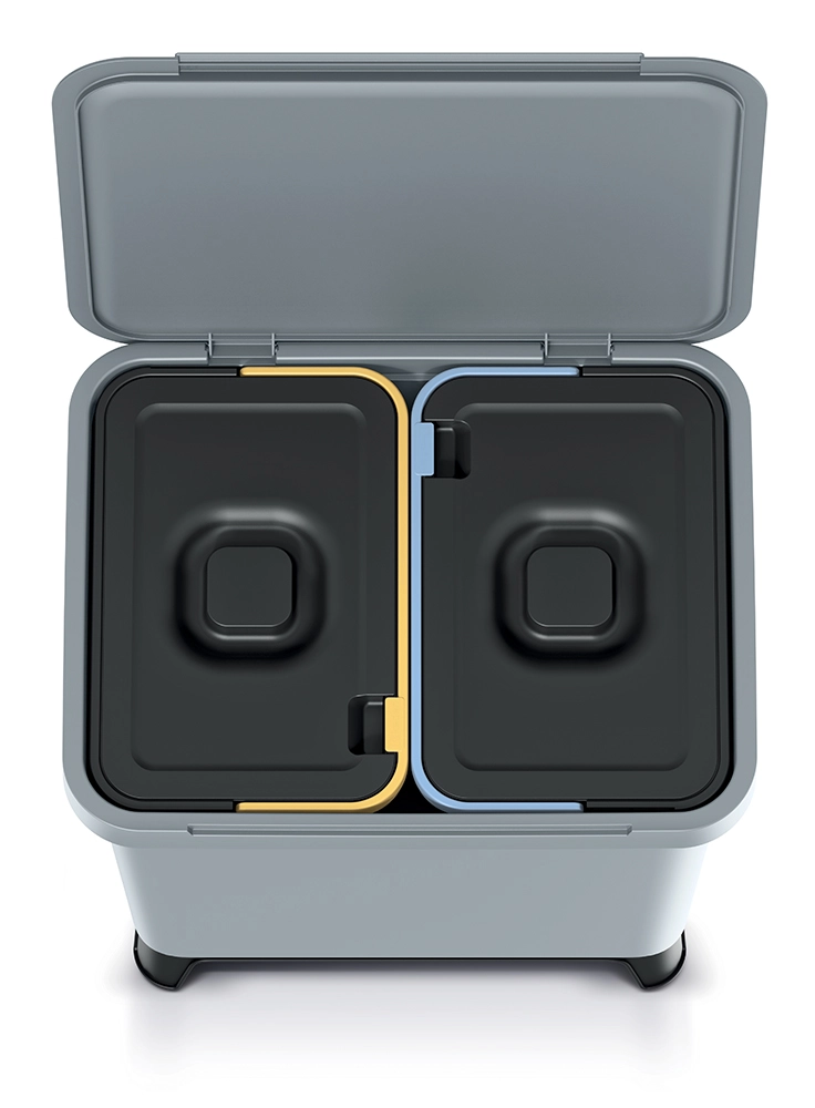 Deux inserts amovibles avec poignées pratiques permettent de séparer rapidement les plastiques, le papier et les déchets ménagers, et de les transporter aisément.