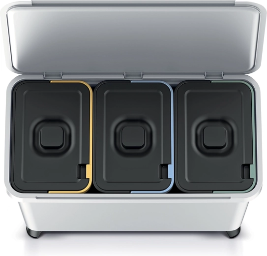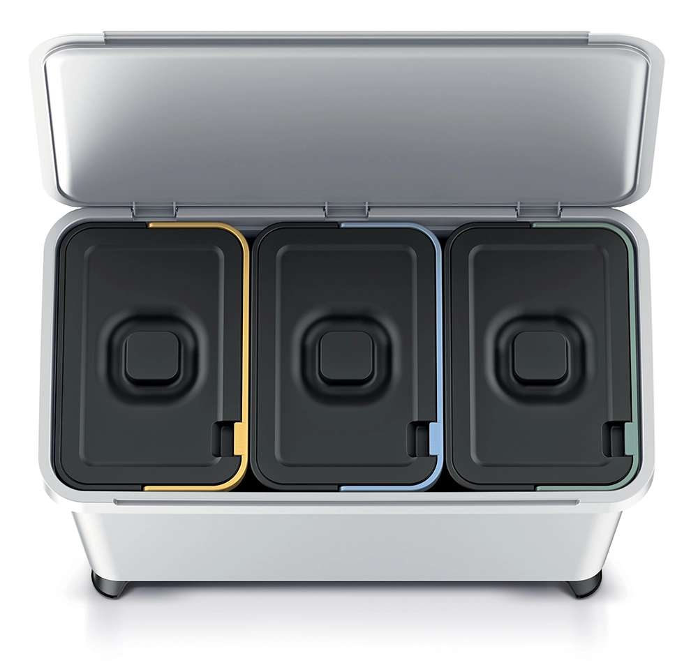Trois bacs intérieurs amovibles de 10 l chacun avec couvercles colorés accélèrent le tri et maintiennent l’ordre en un seul endroit.