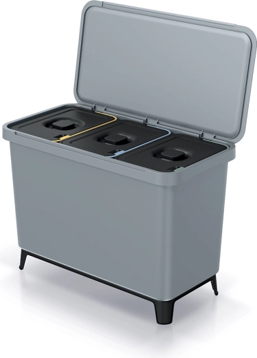 La poubelle est fabriquée en plastique de qualité, résistant à un usage quotidien et facile à nettoyer. Les pieds stables assurent une bonne assise au sol et, grâce aux poignées solides, chaque récipient peut être retiré et transporté confortablement.