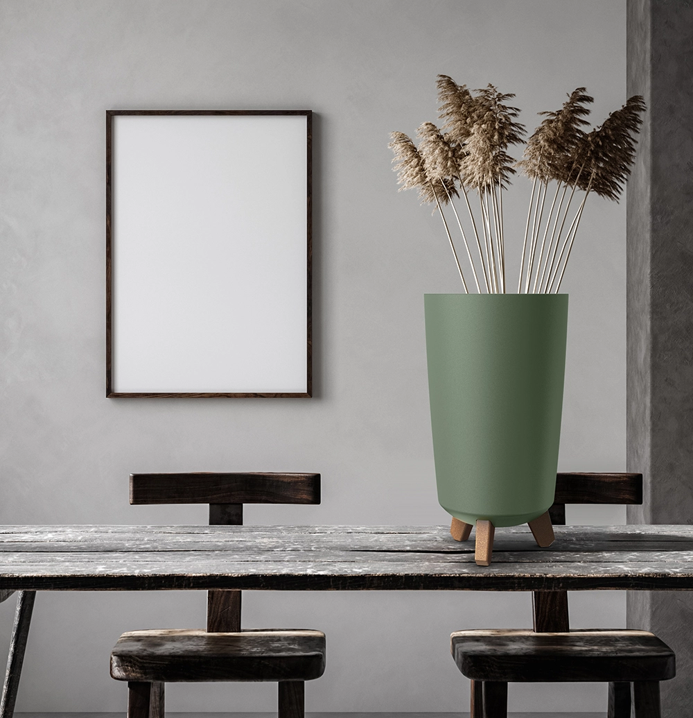 Trois à quatre pieds courts en bois apportent hauteur, stabilité et légèreté visuelle. La plante est mise en valeur et l’air circule sous le cache-pot.