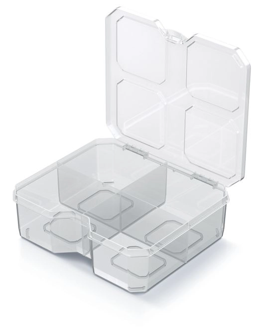 L’organiseur pratique SQR box aux dimensions 15,6 × 14 × 5 cm offre un rangement clair des petits objets à la maison, au bureau et à l’atelier. Grâce à sa conception transparente, trouvez rapidement ce dont vous avez besoin sans ouvrir. Quatre compartiments solides et des cloisons résistantes maintiennent vis, trombones et autres accessoires bien en place, tandis que le corps en plastique léger facilite la manipulation et le transport.