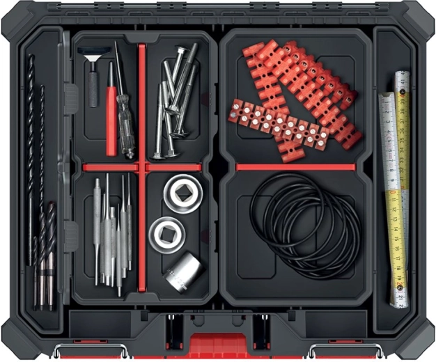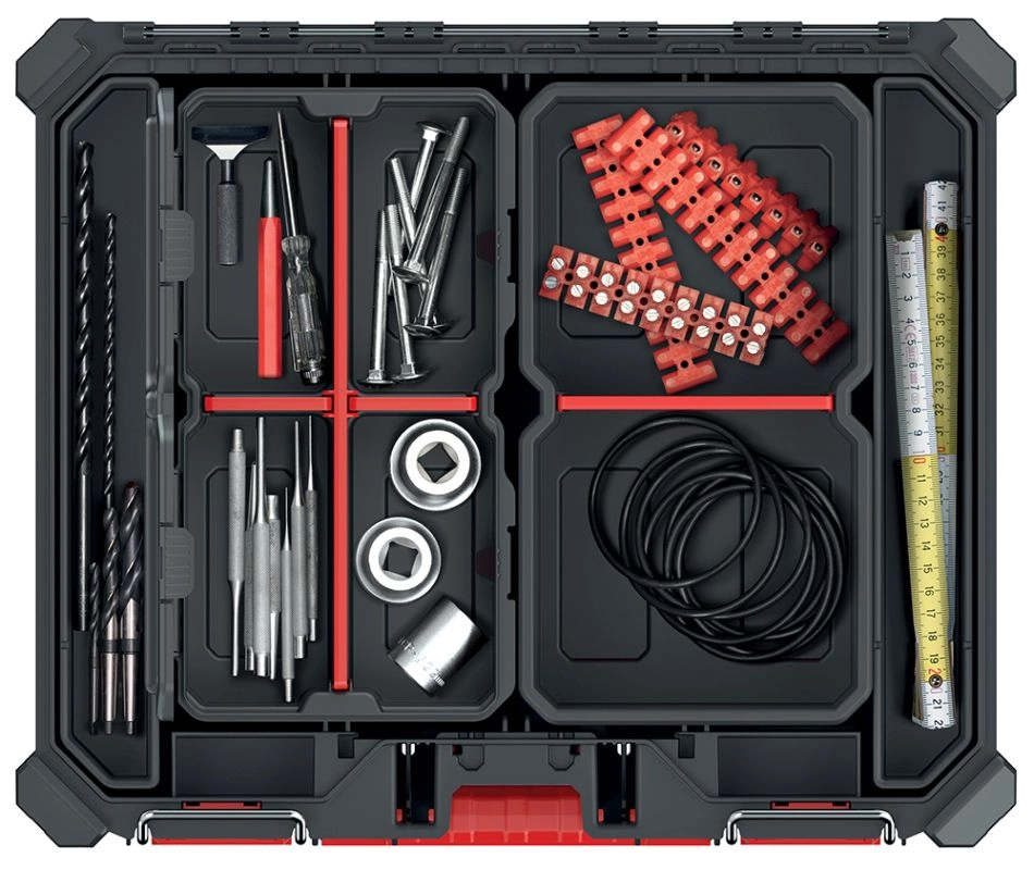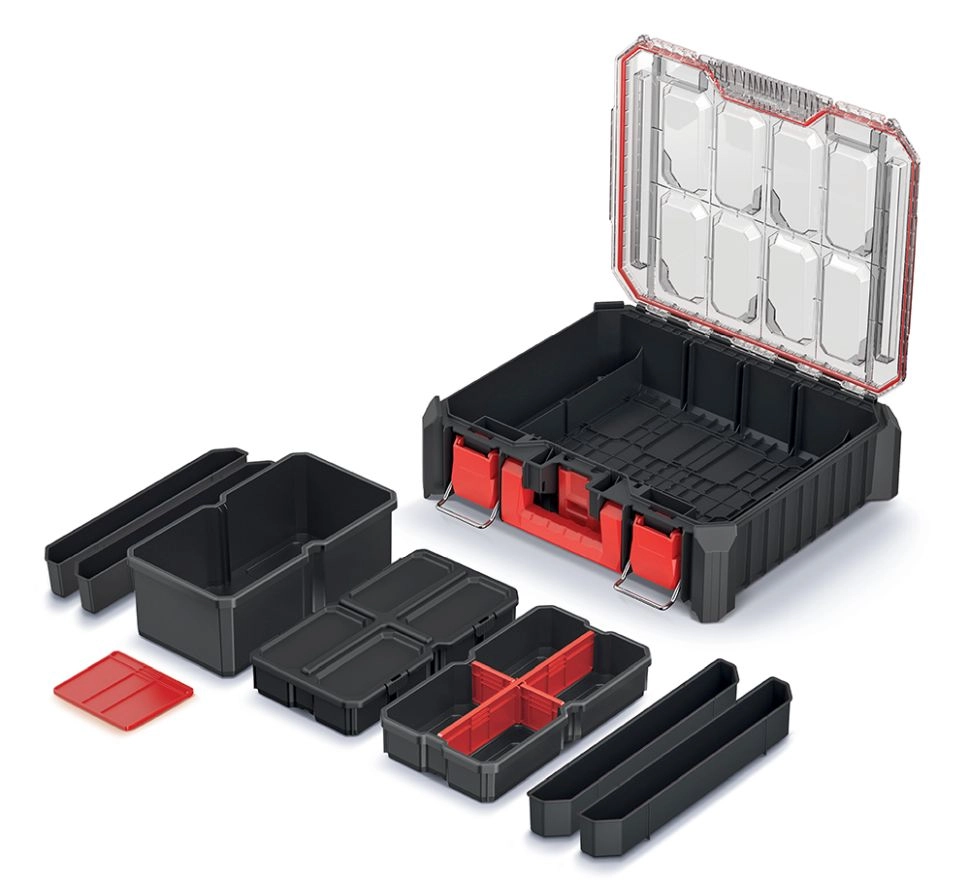 L’espace intérieur se personnalise selon vos besoins – 6 bacs amovibles et 4 séparateurs amovibles sont à votre disposition. Les charnières métalliques et les verrous résistants en plastique ABS augmentent la longévité globale et la sécurité lors du transport. Le corps en polymère résistant supporte un usage quotidien et protège l’équipement stocké contre les chocs.