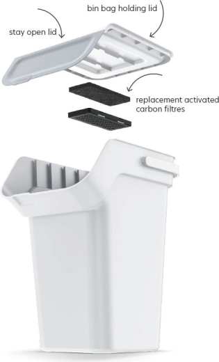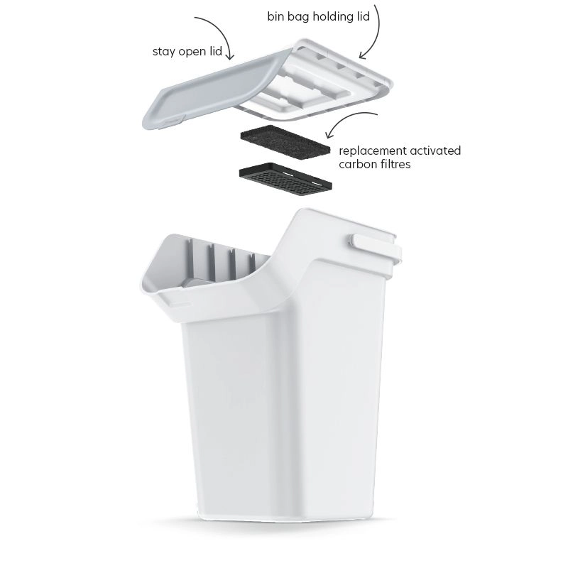 Sous le couvercle se trouve un filtre au charbon actif qui absorbe efficacement les mauvaises odeurs et aide à garder la maison fraîche. La poignée ergonomique facilite le transport et l’entretien, tandis que le couvercle qui reste ouvert lorsqu’il est complètement relevé rend l’utilisation quotidienne plus agréable.