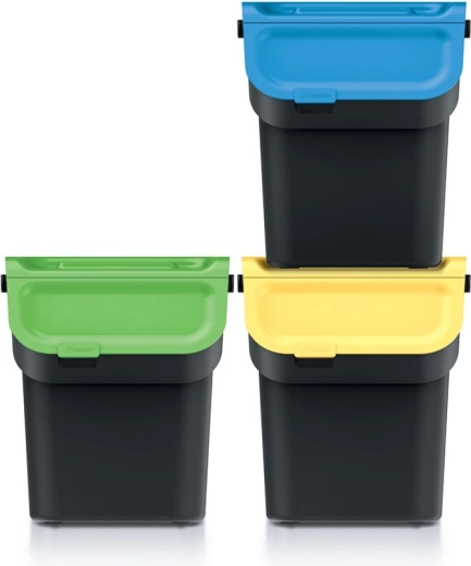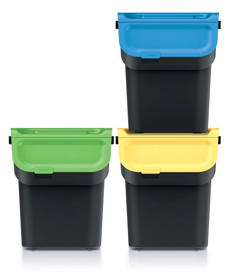 Ensemble pratique de trois poubelles de 3×20 l pour un tri des déchets efficace à la maison comme au bureau. Grâce à la construction modulaire, elles peuvent être facilement empilées ou placées côte à côte. Chaque poubelle possède un couvercle avec filtre à charbon actif pour neutraliser les odeurs, une conception en plastique résistant en noir recyclé et une poignée confortable pour un transport aisé.