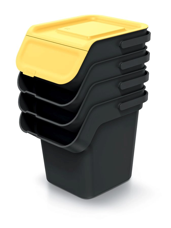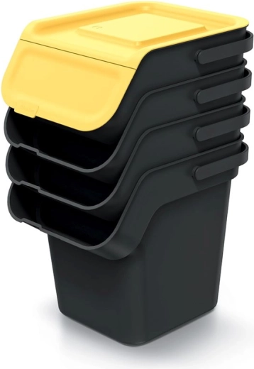 Ensemble pratique de 4 bacs de 20 l pour un tri des déchets facile à la maison. Plastique noir recyclé, volets colorés pour une orientation rapide et construction empilable pour gagner de la place. Chaque bac possède un filtre à charbon remplaçable contre les odeurs et un cadre intérieur pour maintenir solidement le sac.
