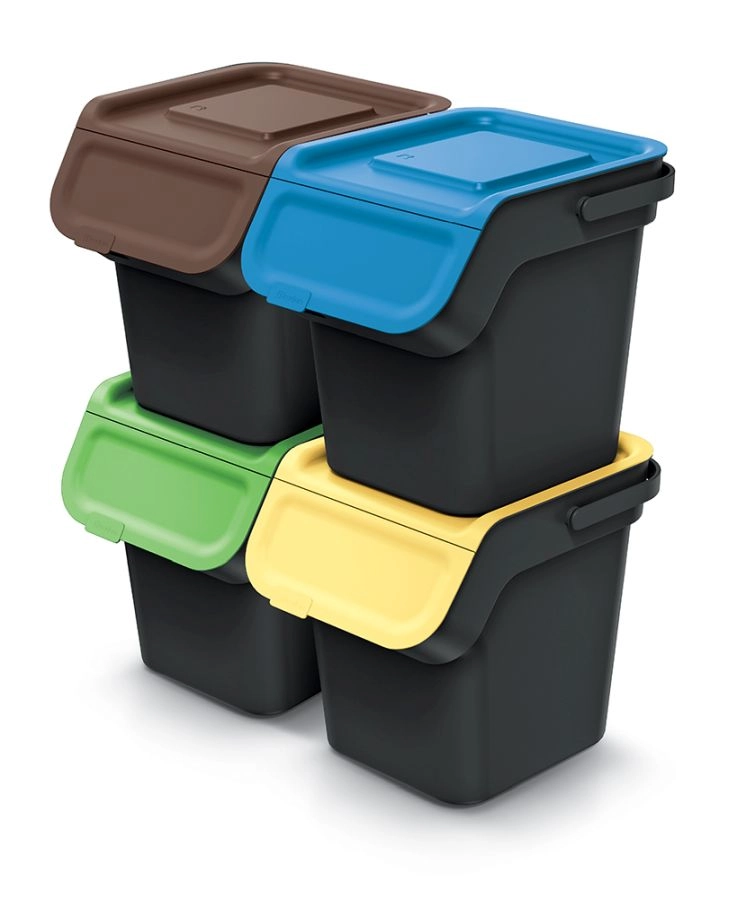 Quatre bacs avec couvercles de couleurs différentes (marron, bleu, vert, jaune) facilitent une orientation rapide lors du tri des déchets.