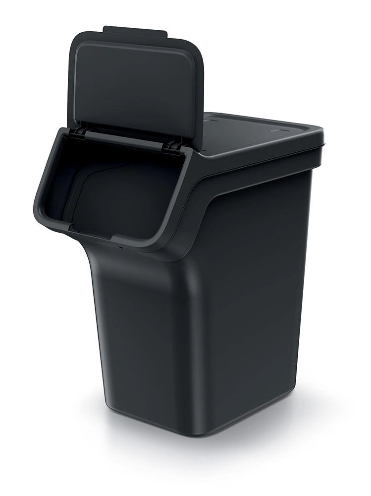 L’ouverture frontale basculante permet un dépôt rapide, tandis que le couvercle supérieur offre un accès facile au contenu. Une fois entièrement ouvert, le couvercle reste en position.
