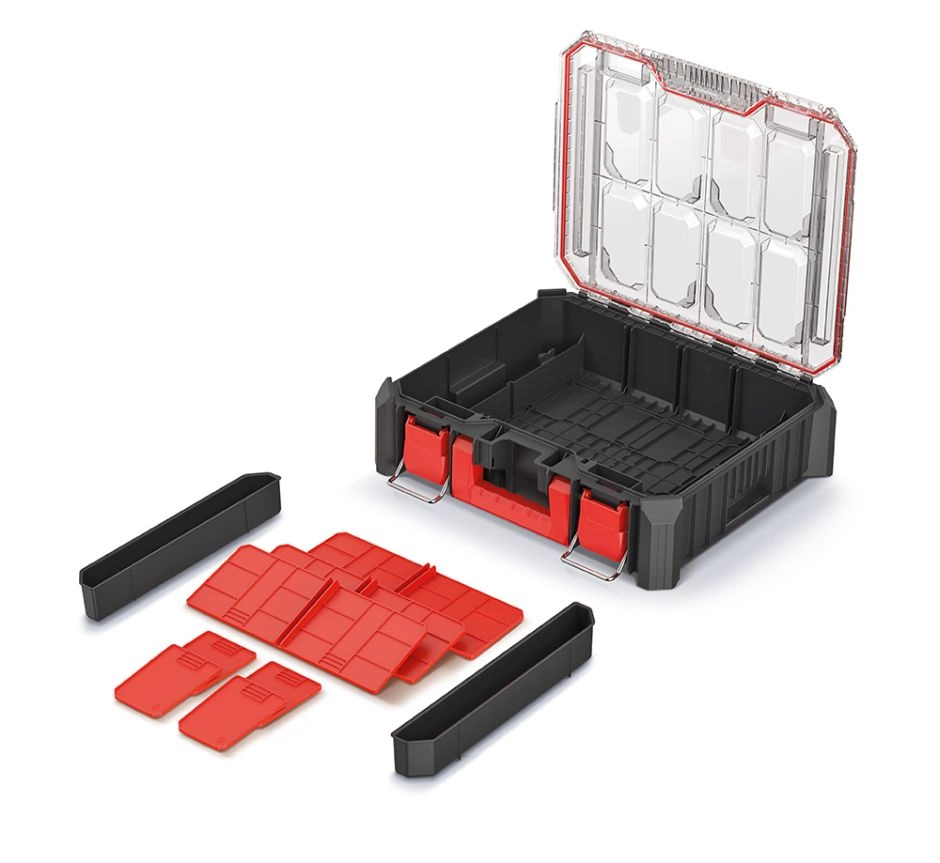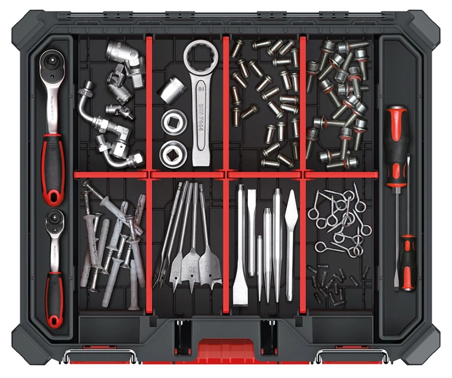 Un agencement intérieur astucieux avec 2 bacs séparés et 7 compartiments amovibles facilite l’organisation des vis, chevilles, forets et petits accessoires. Un joint de qualité empêche l’intrusion de poussière et d’eau, protégeant ainsi les objets stockés. Des charnières métalliques et des clips ABS solides maintiennent le couvercle bien fermé, et la poignée ergonomique assure un transport confortable.