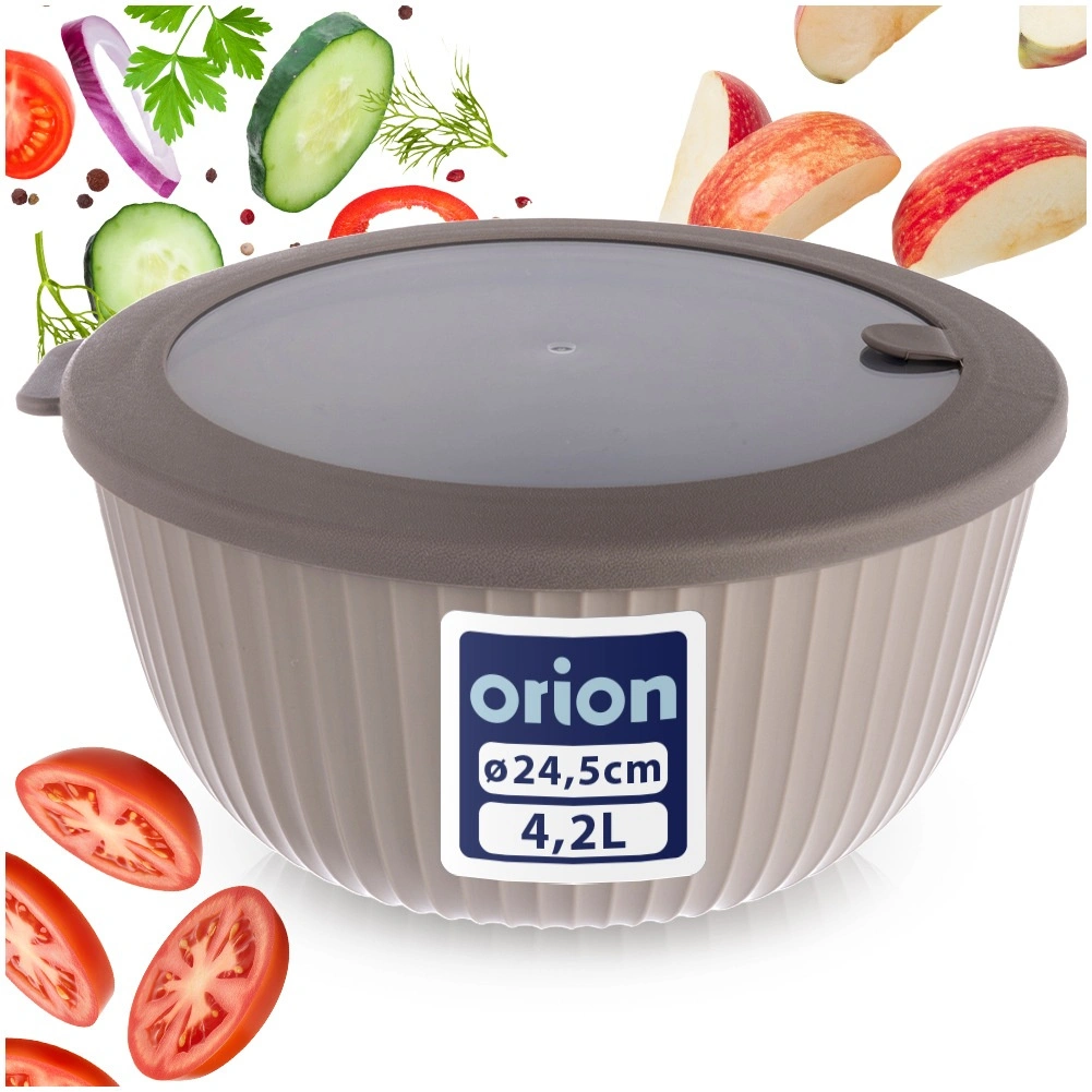 Bol de cuisine pratique d’une capacité de 4 l et d’un diamètre d’environ 24,5 cm, idéal pour mélanger, faire lever les pâtes, servir des salades et conserver ou réchauffer des plats. Il possède un couvercle transparent avec joint d’étanchéité et orifice pour vapeur au micro-ondes, est sans BPA, résistant de -25 °C à +95 °C et compatible lave-vaisselle.