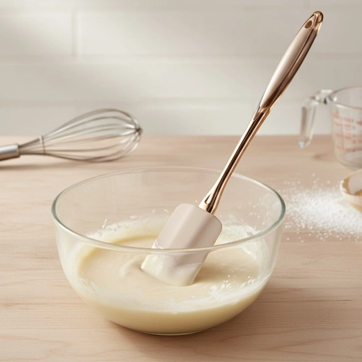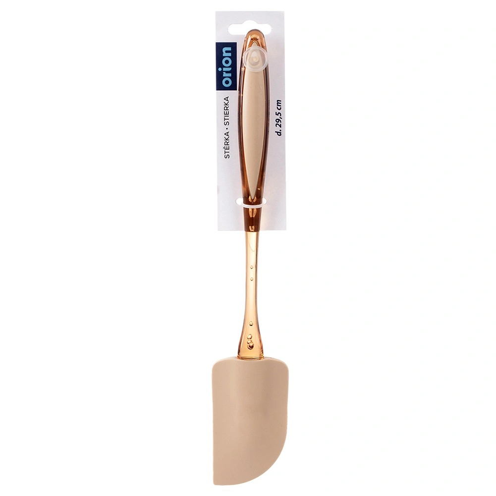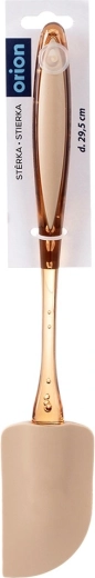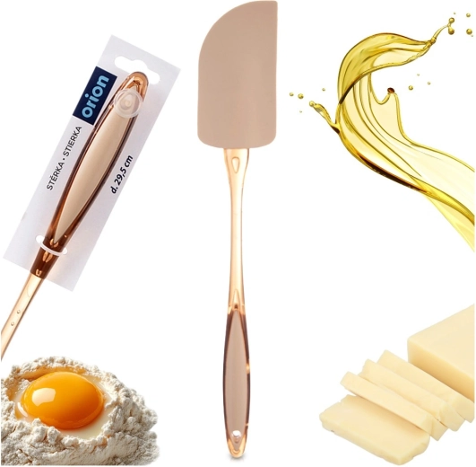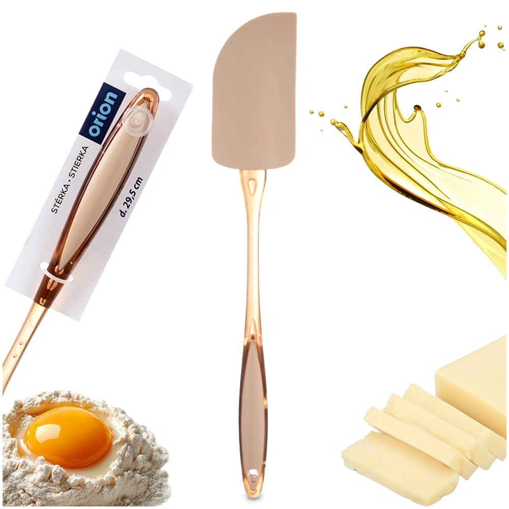 Spatule de cuisine universelle en silicone dans une élégante couleur beige, idéale pour mélanger, prélever et étaler crèmes, glaçages et pâtes. Sa tête flexible épouse délicatement la forme du bol et racle parfaitement les restes sur les parois sans rayer la surface.
