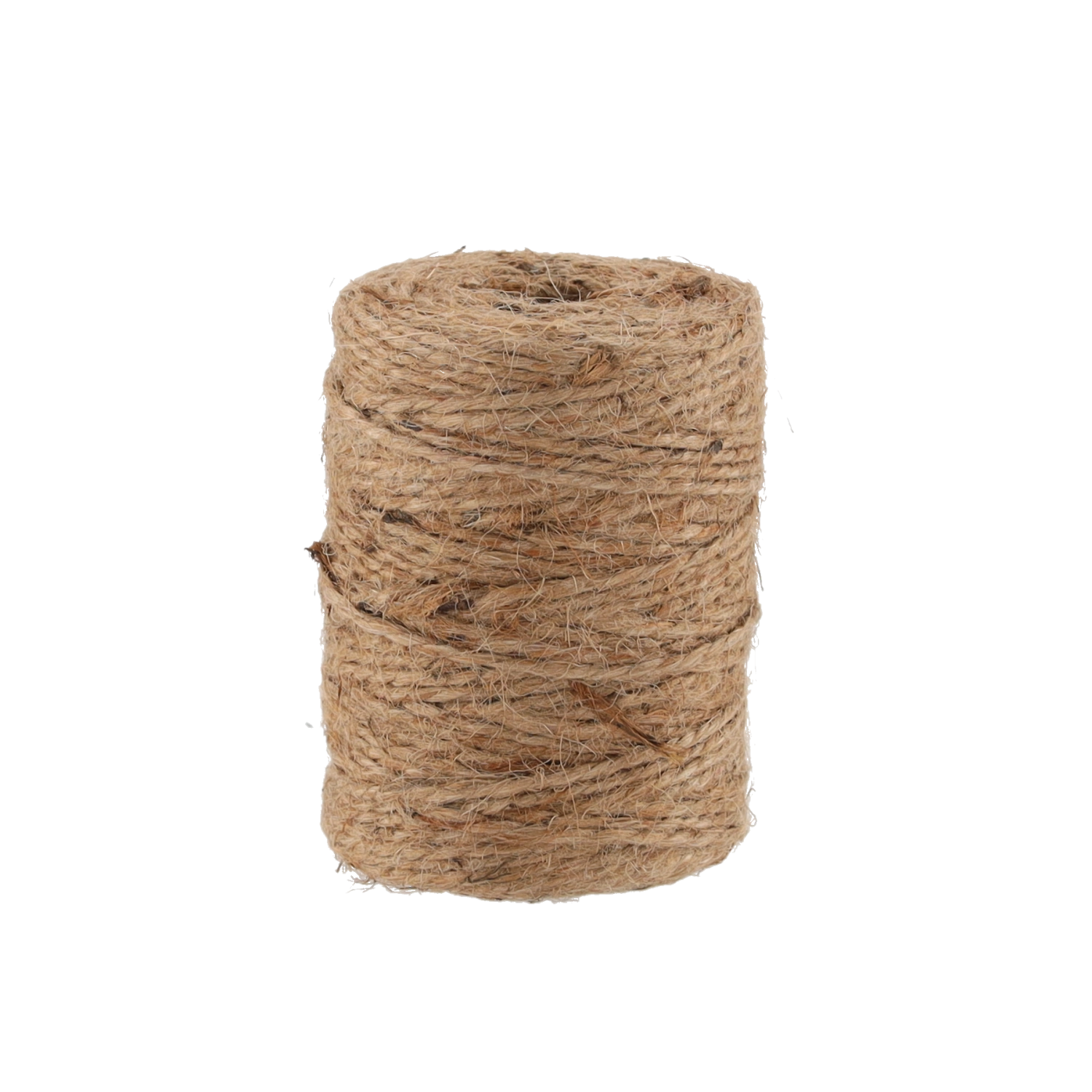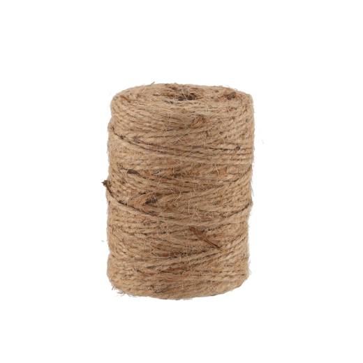 En jute 100 %, épaisseur 2 mm – résistante aux intempéries et entièrement biodégradable. Idéale pour tuteurer les plantes, l’emballage et la décoration.