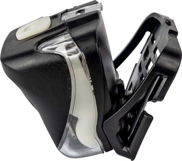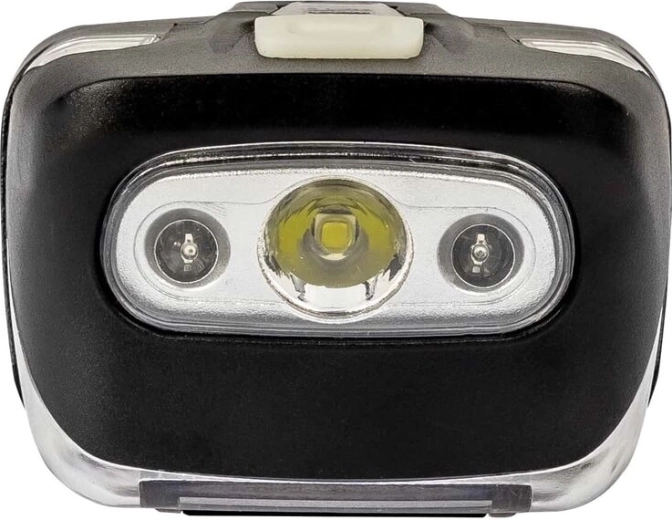 Le corps en polycarbonate avec revêtement caoutchouté est résistant et sûr en cas de chute jusqu’à 80 cm. La commande se fait via un unique bouton supérieur : bascule rapide des modes blancs et activation de la lumière rouge par appui prolongé. L’alimentation est assurée par 3× AAA (alcalines ou NiMH), le bandeau est réglable et grâce à la protection IP44 la lampe supporte aussi la pluie.