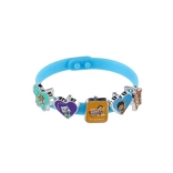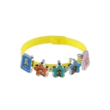 3 bracelets en silicone (jaune, bleu, rouge), 18 breloques, notice